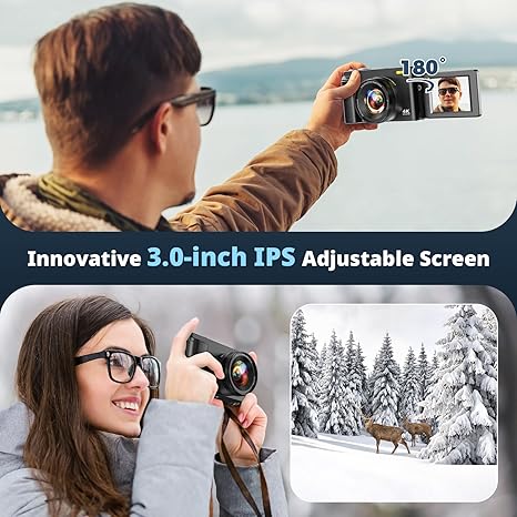 - 3.0″ IPS 180° Flip Screen for Perfect Selfies & Vlogging: The 3.0-inch IPS flip screen rotates 180°, making it easy to frame yourself for stunning selfies and vlogs. This portable compact digital camera is perfect for travel, vacations, and everyday use, fitting easily in your pocket or bag.